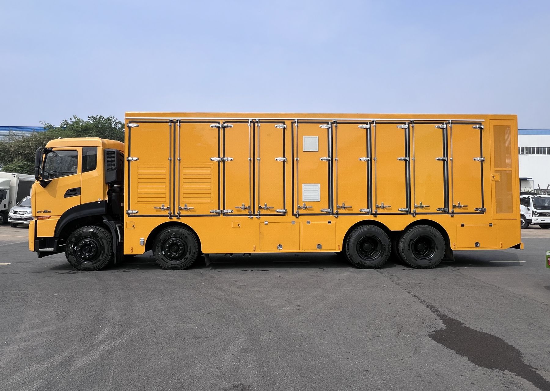 一、底盤配置: 采用東風DFH1310A9車身,配置玉柴DDi75E340-60發動機250KW馬力,國六排放標準,軸距1995+4600+1350(mm),整備質量30.87噸,額定載質量0噸,五擋變速箱,帶動力轉向,帶原廠空調,該車廂內裝有發電機組,變壓器,散熱設備等,主要用于處理突發事件的應急搶險供電;車廂頂部封閉且不可開啟;隨底盤選裝駕駛室,選裝限速裝置,限速89km/h;側面防護裝置材料:Q235B碳鋼,裙邊結構;后部防護裝置材料:Q235B碳鋼.連接方式:采用螺栓連接.后部防護斷面尺寸(寬×高)(mm):80×160,后部防護離地高度(mm):480;該車上黃牌,城區道路請注意限行標識。