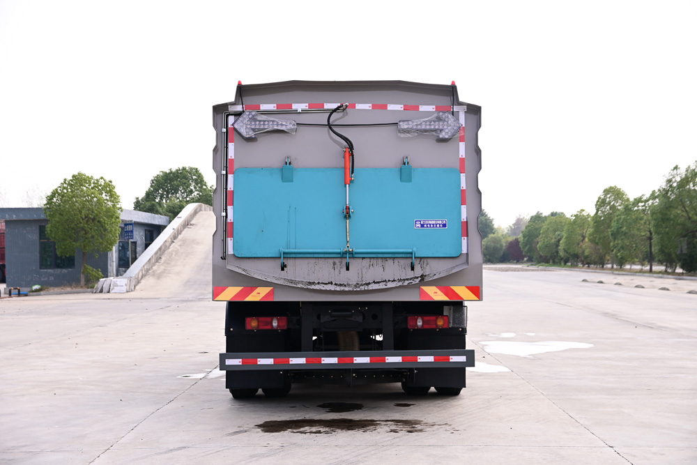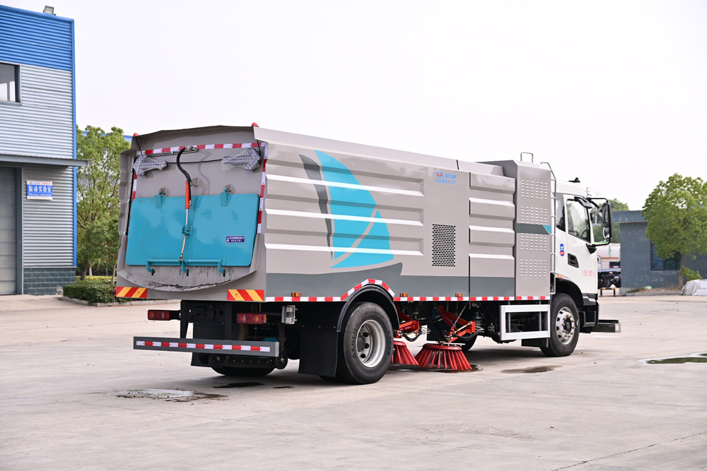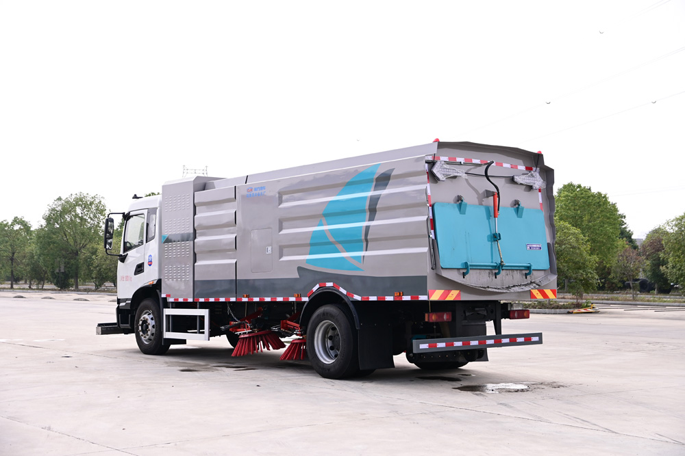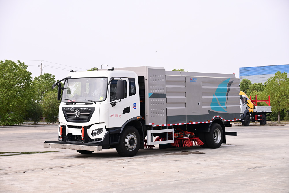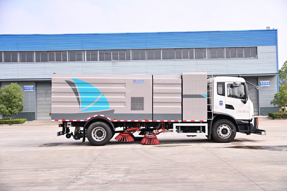 3、掃路車采用東風純電動二類汽車底盤改裝,加裝風機、清水箱、垃圾箱、左右立掃、掃盤降塵系統、液壓