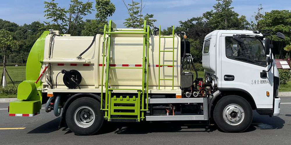 整車為全封閉型,采用電氣液一體化技術(shù),借助機(jī)、電、液聯(lián)合自動(dòng)控制系統(tǒng),通過(guò)垃圾箱、上料機(jī)構(gòu)和推鏟等專用裝置,實(shí)現(xiàn)垃圾收集和卸料。