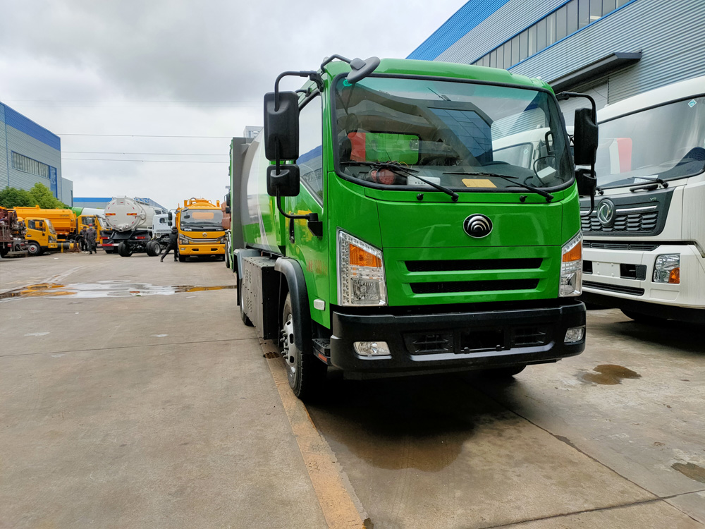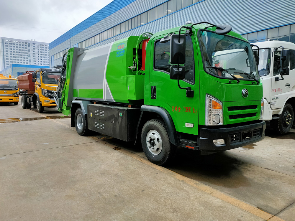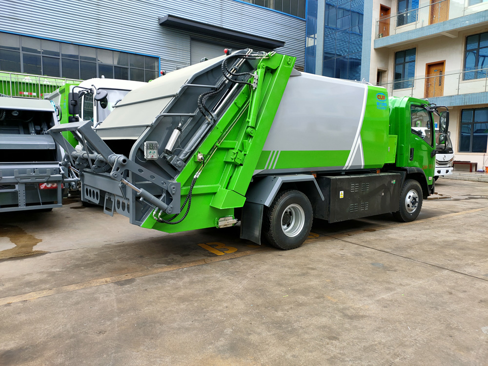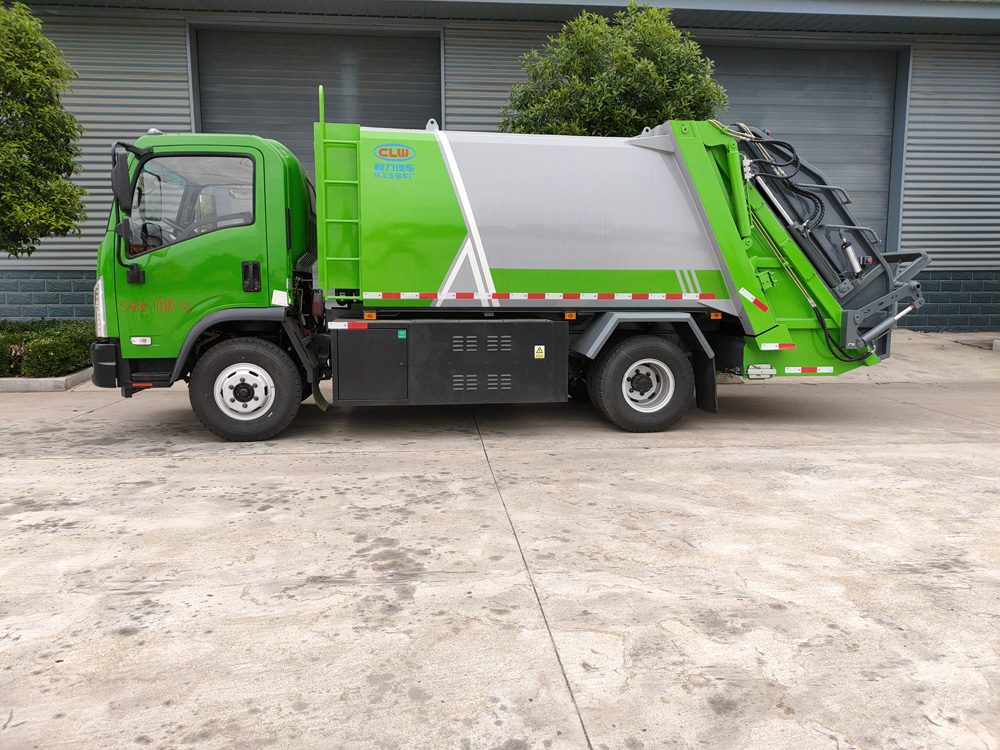 6. 方便的操作控制,作業控制盒分別安裝在駕駛室內和車尾右側,左側帶緊急停止按鈕,配備遙控器,駕駛室內的作業控制盒可控制推擠卸料和選擇操作模式(如自動或手動),車尾的作業控制盒則控制壓填機構和翻桶機構的作業,使用操作十分方便。特別是在垃圾填埋場,作業人員無須下車即可完成卸料和污水排放。