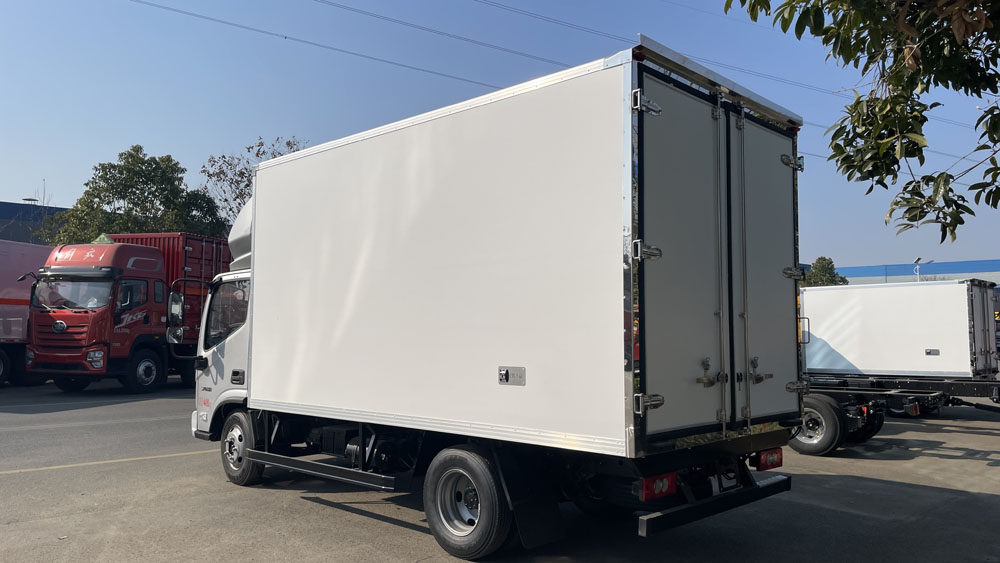 二、廂體配置:采用我司《晶龍工藝》專利技術——1200噸液壓加熱固化設備一體成型生產線制造,廂體保溫技術達到國家A級標準,廂體尺寸:080,3700×1960,2100×1800(mm)。工藝特點:1、廂板采用全密封樹脂膠粘連聚氨酯發泡板高壓加熱固化而成,厚度8cm;2、廂板內外面料為2.5mm厚新款納米玻璃鋼(不吸光,隔熱性好,硬度強,抗氧化);3、粘連輔料為玻璃纖維絲布;4、無空隙填充聚氨酯發泡保溫材料;5、全密封樹脂膠粘連;6、預埋實木加固廂體;7、防銹處理槽鋼框架支撐;8、鋁合金包邊、不銹鋼包角;9、內部加裝LED照明燈及廂體示寬燈;10、后門框、鉸鏈、鎖件均為不銹鋼材質;11、后門加裝防撞膠塊;12、采用三元乙丙橡膠密封條。