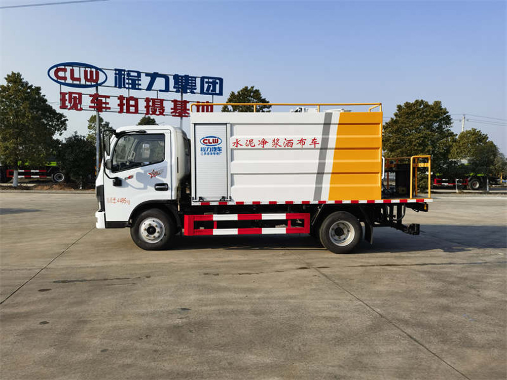 四、其他說明: 水泥罐、清水罐采用 Q235 優質碳鋼制作,高壓水泵,水泥砂漿泵(專用),攪拌系統,液壓系統,15 米高壓清洗管道(帶卷盤、手持清洗槍),尾部 13 個水泥漿專用噴頭,最大灑布寬度 4 米。其它配置常規,可選裝袋裝水泥提升裝置(用于袋裝水泥向罐體頂部運輸)。